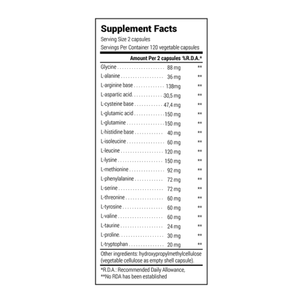 Food supplement with a vegan blend of 20 amino acids, naturally produced by enzyme fermentation. 20 free amino acids do not require digestion so they’re quickly delivered to the body.