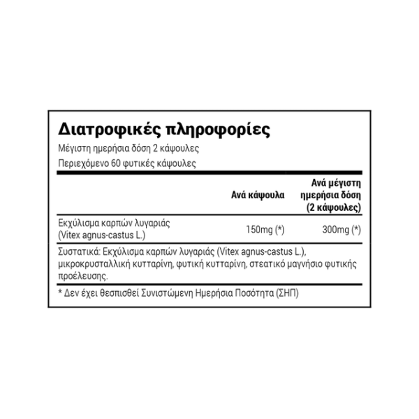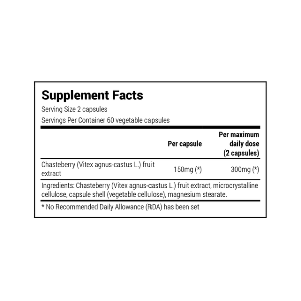 | INGREDIENTS | Supplement Facts per vegetable capsule Chasteberry fruit extract (agnus-castus L.) 150 mg Free from chemical excipients, artificial colourings, artificial flavors, artificial sweeteners, gluten, gmo's. |