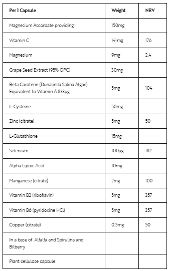 | Ingredients | Per 1 Capsule Magnesium Ascorbate providing: 150mg In a base of Alfalfa and Spirulina and Bilberry |