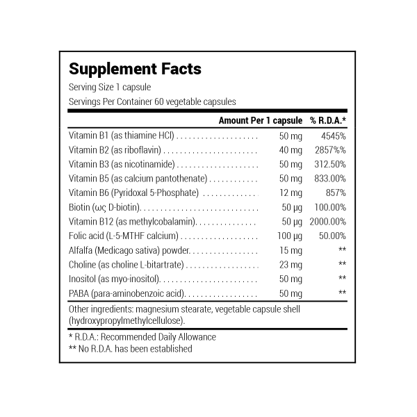Food supplement with B-complex vitamins in active form, in combination with folic acid, alfa alfa powder, biotin, choline, inositol and PABA.