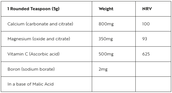 | Ingredients | 1 Rounded Teaspoon (5g) Calcium (carbonate and citrate) 800mg |
