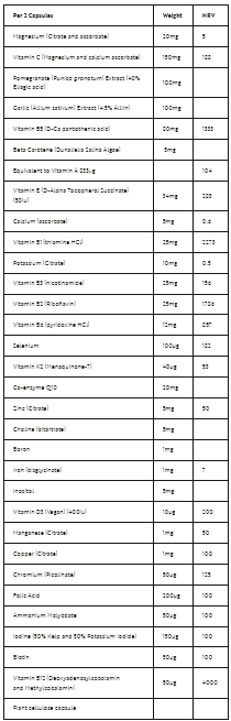 | Ingredients | Per 2 Capsules Magnesium (Citrate and ascorbate) 20mg |