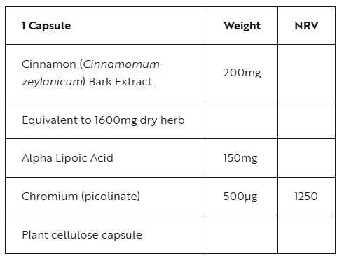 | Ingredients | 1 Capsule Cinnamon (Cinnamomum zeylanicum) Bark Extract. 200mg |