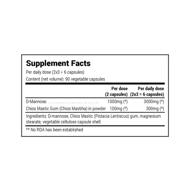 D-mannose & Chios mastic supplement contains D-mannose, and Chios mastic a unique natural ingredient of Greece with protected designation of origin.