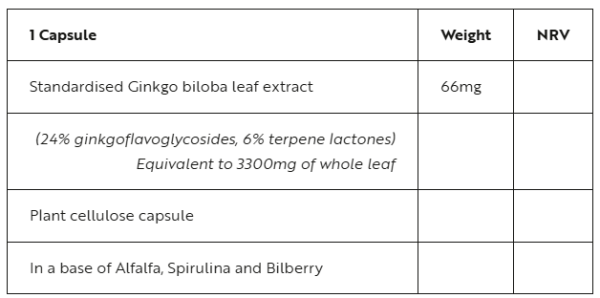| Ingredients | 1 Capsule Standardised Ginkgo biloba leaf extract 66mg |