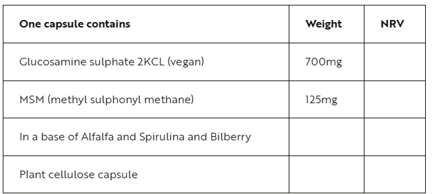 | Ingredients | One capsule contains Glucosamine sulphate 2KCL (vegan) 700mg |