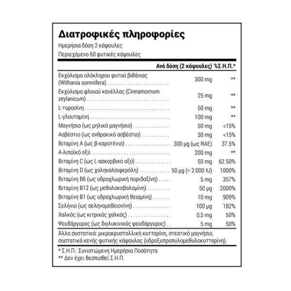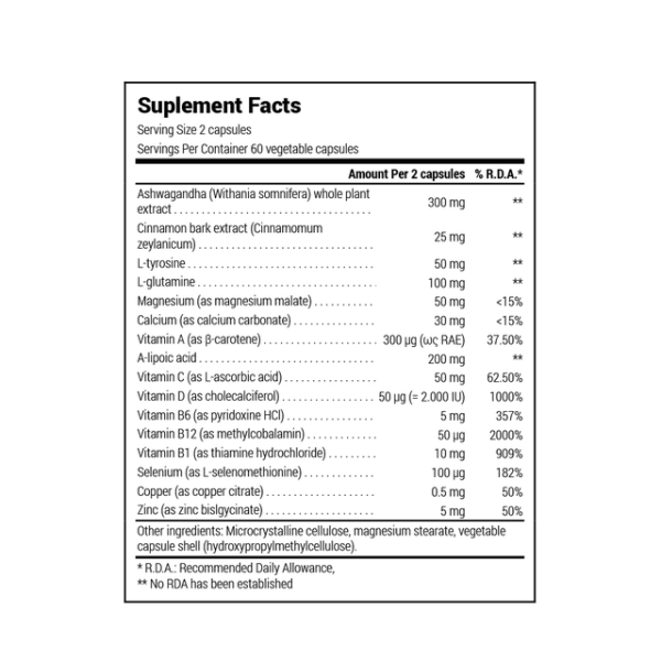 Enriched with nutrients such as ashwagandha, cinnamon, magnesium, L-tyrosine, L-glutamine, calcium, copper, zinc, α-lipoic acid, selenium, vitamins A, C, D, B12 and vitamin B1.
