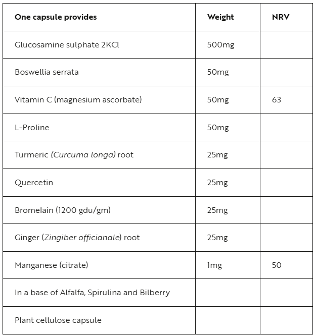 The primary ingredient in this supplement is glucosamine – a nutrient that is found naturally within the body’s connective tissues. This supplement incorporates a therapeutic dose of vegan glucosamine using the highly accredited glucosamine sulphate 2KCl. This has been added to Boswellia, a herbal extract from tree resin – also known as frankincense – which supports joint flexibility and helps to maintain joint health.