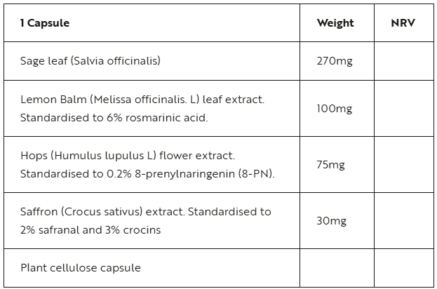 Menopause Complex is an innovative combination of renowned plant extracts including hops, lemon balm, and saffron to provide natural support during this life stage. In a base of sage which helps with physical and mental comfort during the menopause.