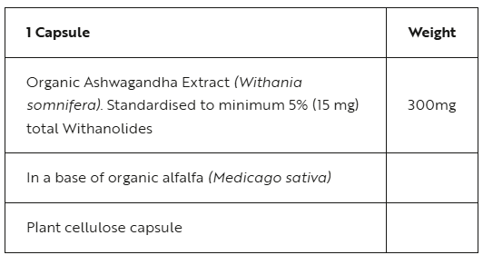 | Ingredients | 1 Capsule Organic Ashwagandha Extract (Withania somnifera). Standardised to minimum 5% (15 mg) total Withanolides 300mg |