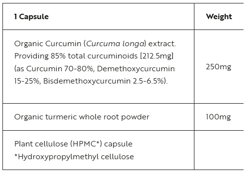 | Ingredients | 1 Capsule Organic Curcumin (Curcuma longa) extract. Providing 85% total curcuminoids [212.5mg] (as Curcumin 70-80%, Demethoxycurcumin 15-25%, Bisdemethoxycurcumin 2.5-6.5%). 250mg |