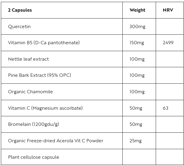 Quercetin & B5 Complex is ideal for the high pollen season and is formulated with quercetin sourced from the Sophora japonica tree. Combined with flavonoid rich plant botanicals and vitamin B5 to contribute to normal mental performance and energy metabolism.