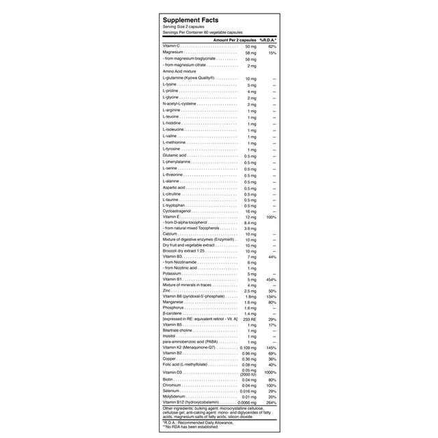 | INGREDIENTS | Supplement Facts – Amount Per 2 capsules • Vitamin C 50 mg Free from chemical excipients, artificial colourings, artificial flavors, artificial sweeteners, gluten, gmo's. |