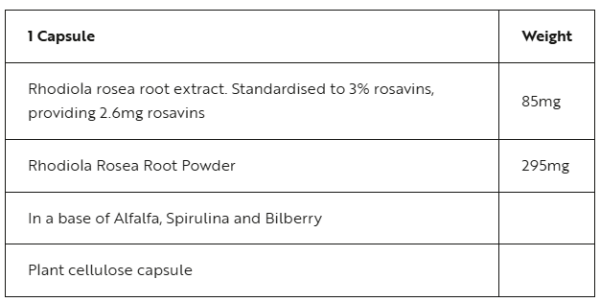 Rhodiola Rosea is a combination of Rhodiola rosea extract, standardised to 3% rosavins, with whole Rhodiola root powder, gently dried to maintain the active compounds. 100% active ingredients formulated by expert nutritionists