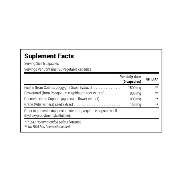Food supplement, Senolytics contains fisetin, resveratrol, quercetin, and grape seed extract, ingredients with an antioxidant effect on the body.