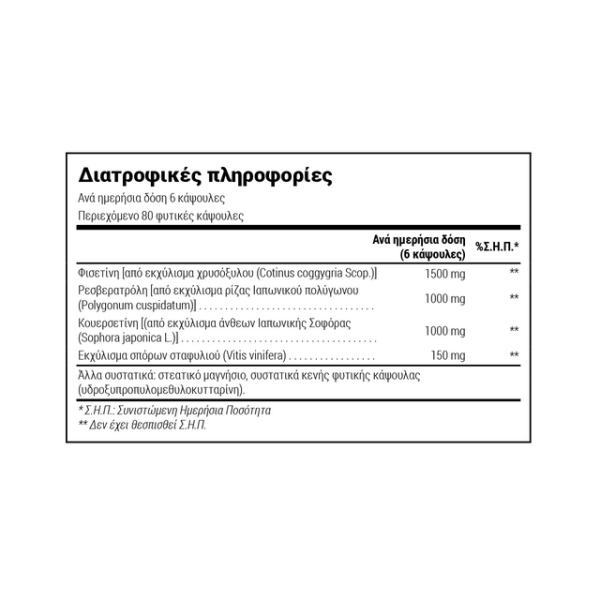 Fisetin belongs to the group of flavonoids and in particular to flavonols, just like quercetin, and they show antioxidant activity proven in the literature. Finally, grape seed extract is rich in antioxidant proanthocyanidins (OPC).