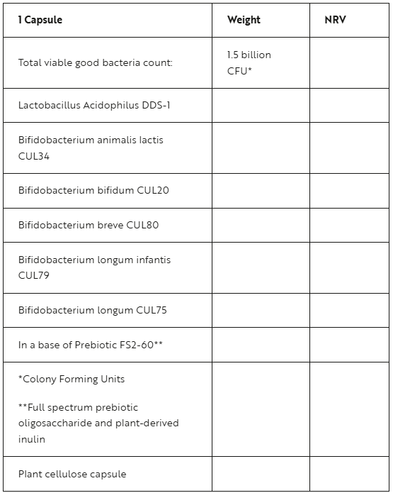 | Ingredients | 1 Capsule Total viable good bacteria count: 1.5 billion CFU* **Full spectrum prebiotic oligosaccharide and plant-derived inulin |