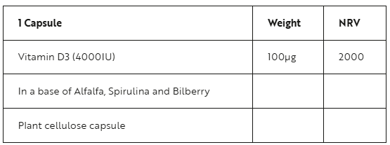 | Ingredients | 1 Capsule Vitamin D3 (4000IU) 100µg |