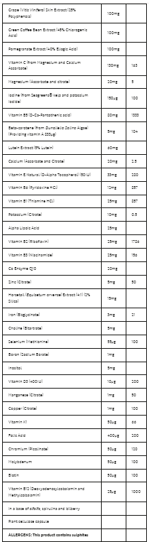Grape skin extract is naturally high in antioxidants and helps to improve the overall health and appearance of the skin, as well as contributing to a healthy blood pressure. Biotin, zinc, selenium and horsetail (Equisetum arvense) extract help to maintain hair and nails in optimum condition, whilst the addition of kelp assists with weight management.