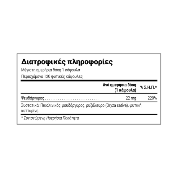 | INGREDIENTS | Supplement Facts – Per daily dose (1 capsule) Zinc – 22mg Free from chemical excipients, artificial colourings, artificial flavors, artificial sweeteners, gluten, gmo's. |